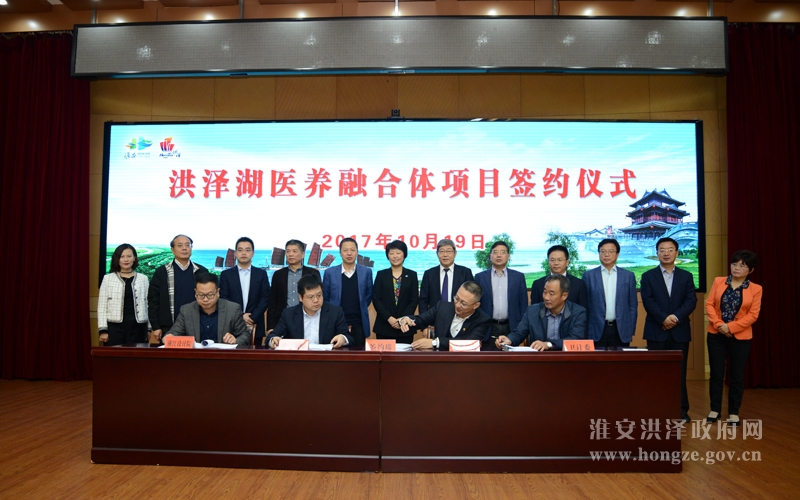 10月19日,我区洪泽湖医养融合体项目成功签约。深圳达实智能股份有限公司董事长刘磅,中国江苏国际经济技术合作集团有限公司总经理王斌,浙江省建筑设计研究院院长张金星出席签约仪式。副市长王红红对洪泽湖医养融合体项目成功签约表示祝贺。区委书记朱亚文致辞。区长殷强主持仪式。市卫计委主任孙邦贵,区委常委、常务副区长杨国仁,副区长徐琳等参加。